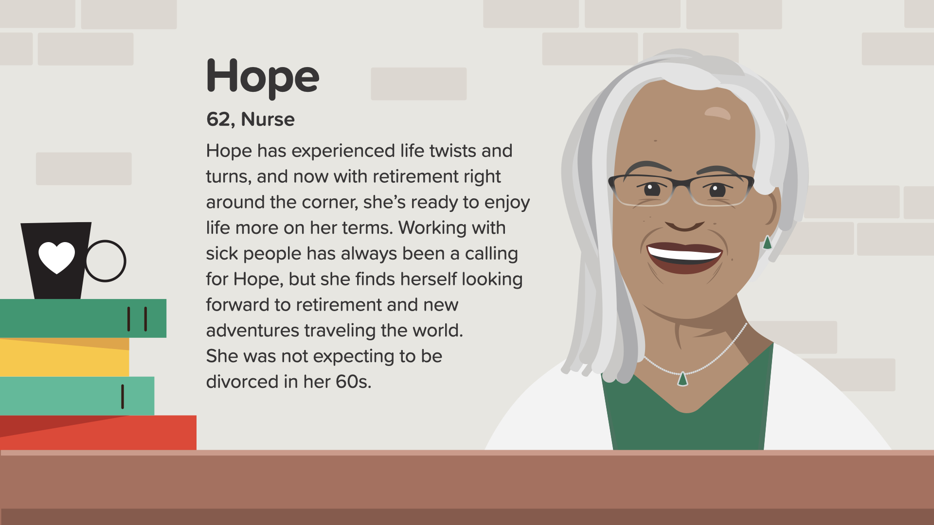 At age 62, Hope has started considering her options in retirement. She thought she and her husband of thirty years would enjoy retirement together. Hope never saw the divorce coming. With just a few years left to save before retirement, she wants to be sure she receives everything she is entitled to in the divorce and to make the right decision for herself on when to claim Social Security benefits.