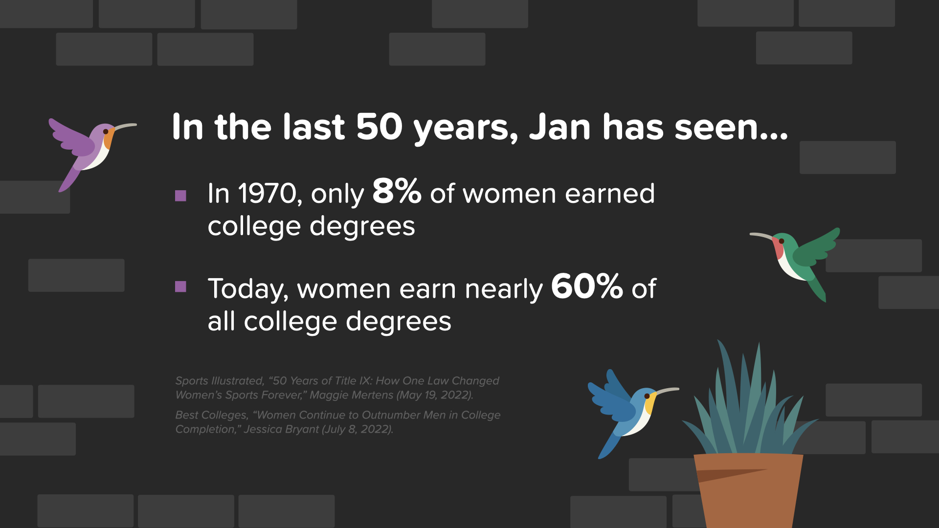 In the last 50 years, Jan has seen women make incredible progress in achieving academic success. Title IX was passed in 1972 and prohibited gender discrimination in educational programs. At that time, only 8% of women earned college degrees. One generation later, women earn nearly 60% of all college degrees. So, Jan is hopeful that her granddaughters and great-granddaughters can achieve anything they set their mind to. She can’t wait to see the impact they will have in this world.