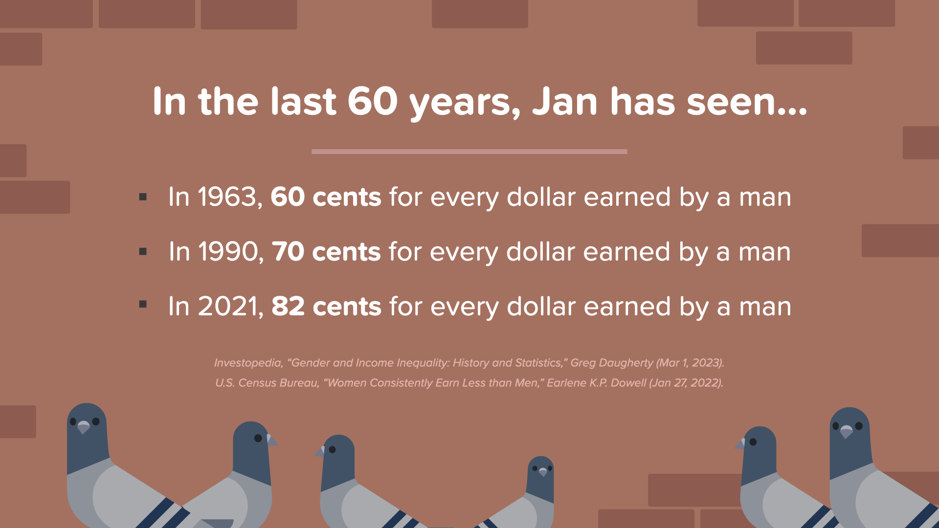 In the last 60 years, Jan has seen the gender pay gap narrow from 60 cents in 1963 when President Kennedy signed the Equal Pay Act. 30 years later, in 1990, the gender pay gap was at 70 cents. And, another 30 years later, in 2021 and today, the gender pay gap is at 82 cents for every dollar earned by a man. Jan’s hope is that her granddaughters and great-granddaughters won’t have to wait another 30 years before they see the equal pay promised in 1963.