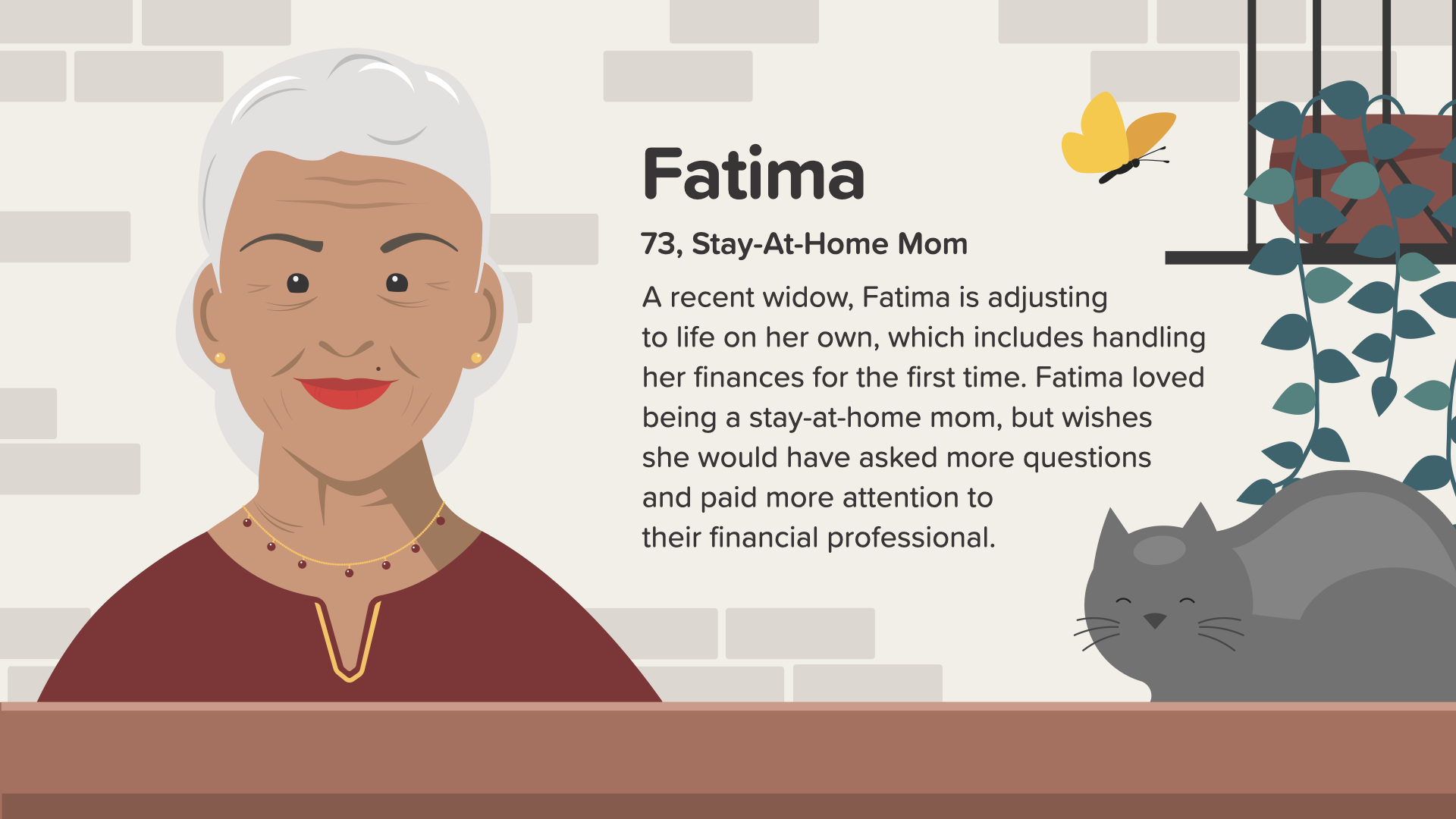 Fatima is 73 and loved being a stay-at-home mom. She left all of the financial decisions to her husband. Unfortunately, her husband recently passed away and Fatima doesn’t know what bills to pay or what investments they have. She doesn’t know where to start, and when she asks her husband’s financial professional, he just tells her she’ll be okay without explaining anything.