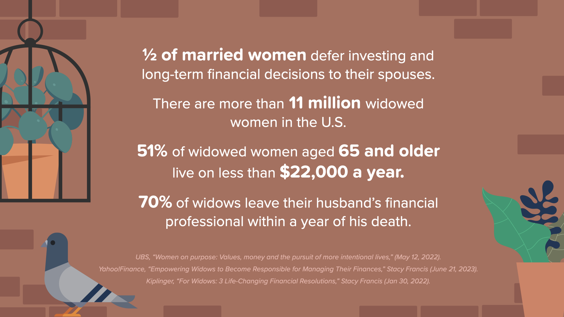 Half of married women defer investing and long-term financial decisions to their spouses. There are more than 11 million widowed women in the U.S. today. 51% of widowed women aged 65 and older live on less than $22,000 a year. I don’t know how anyone does that.