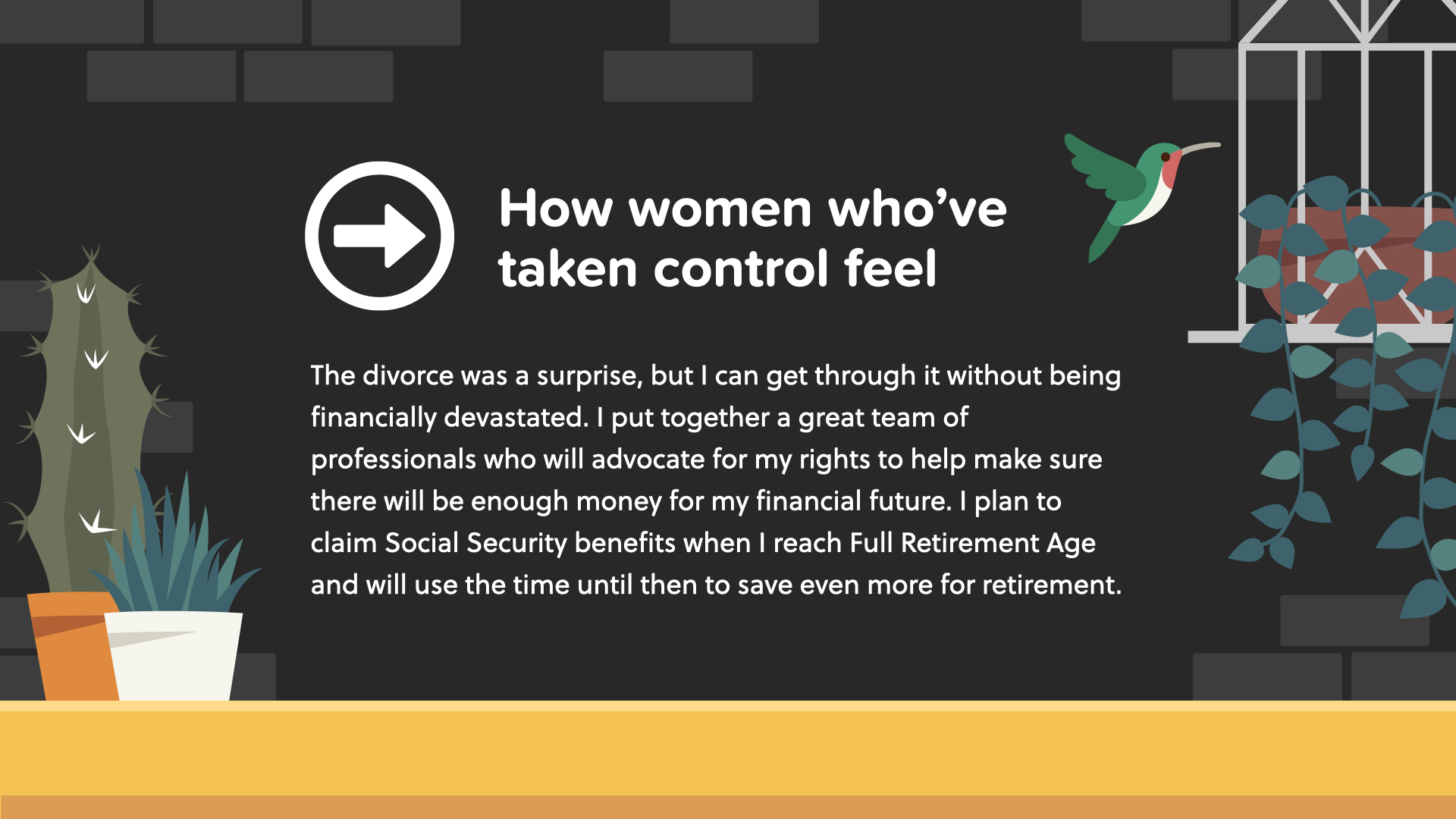 At the end of Hope’s chapter, we want the reader to feel hopeful even in the face of a devastating surprise like a divorce. With a team of professionals who will advocate for your rights, you can come up with a plan for your financial future. And, with a better understanding of Social Security, you can decide when it’s the right time for you to claim benefits.