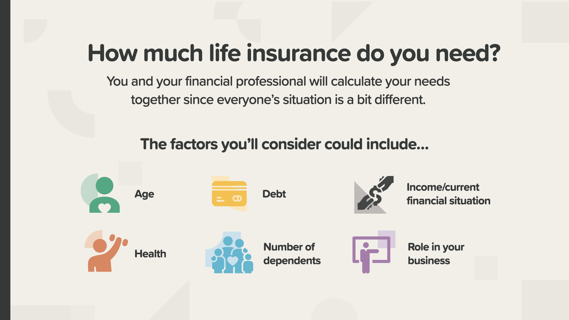 For a more specific calculation of your family’s need, ask your financial professional. Together, you can consider factors like how old you are, how much debt you have, your health, your number of dependents, your role in your business, and your overall financial situation.