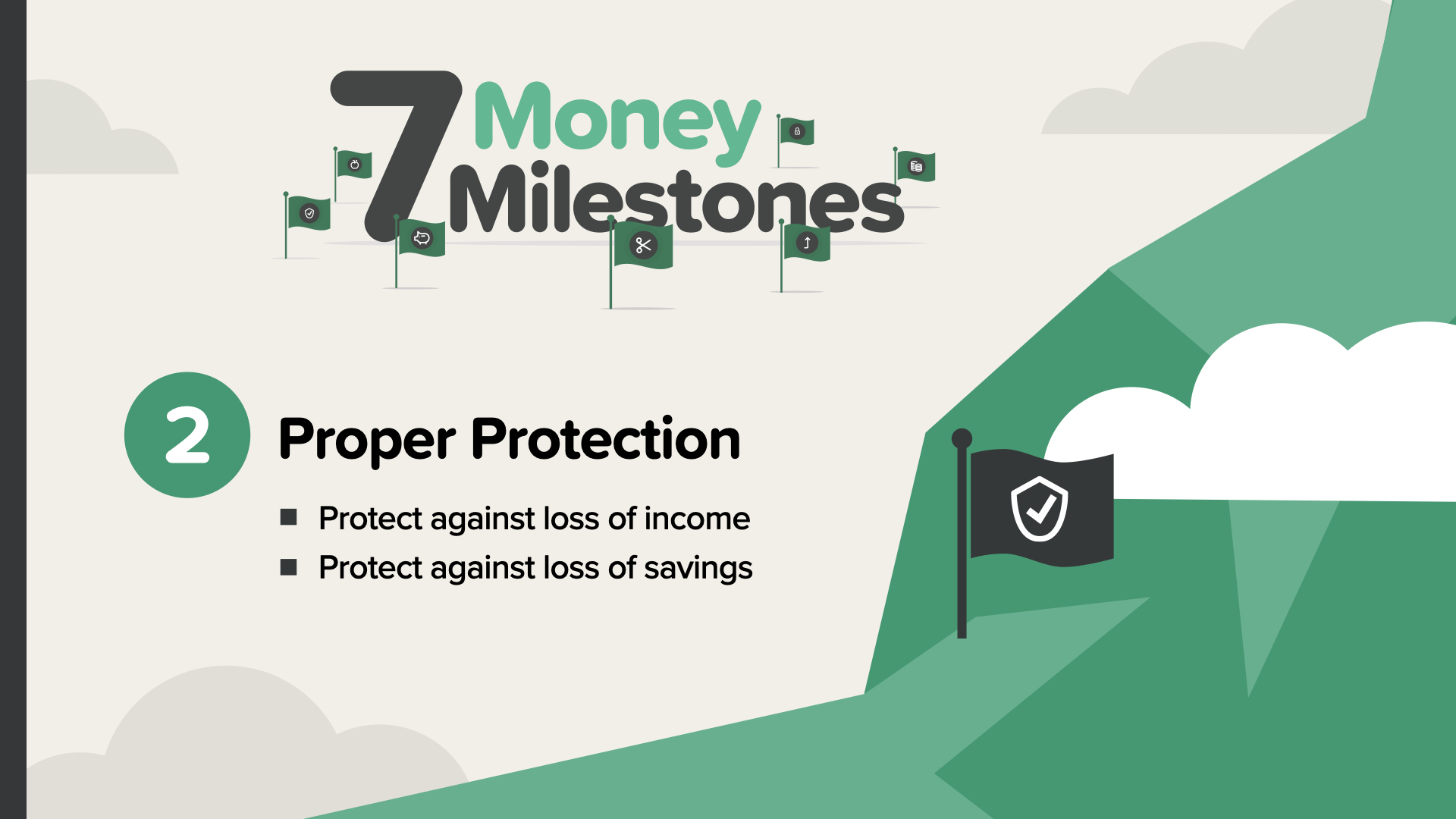 Proper Protection is Milestone #2 on the roadmap for an important reason. You need to protect yourself and your family from a possible future loss of income or savings before you continue the rest of this journey. If you were to die prematurely, your family could be left without your income in addition to being without YOU. Your current savings alone might not be enough to take care of them.