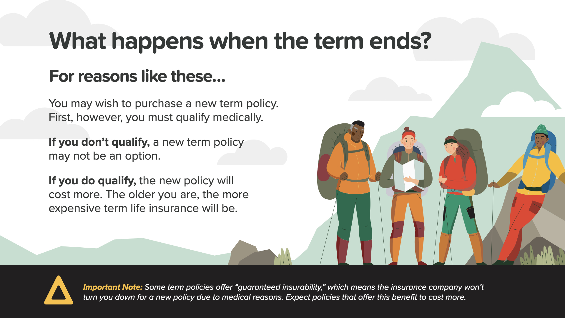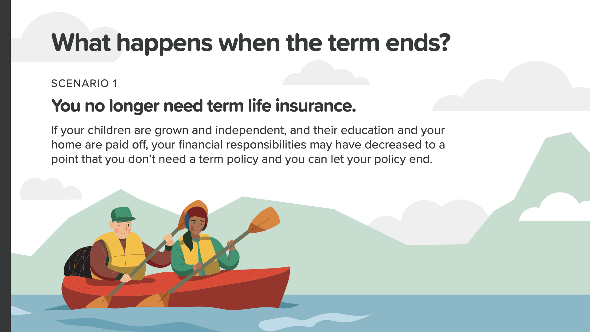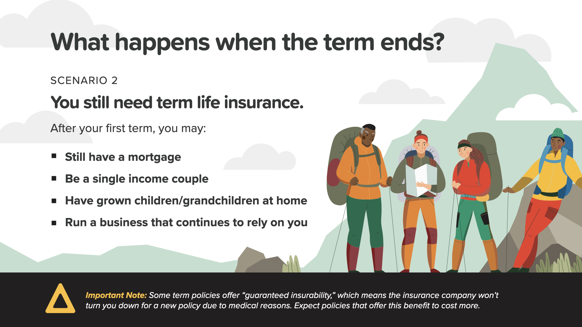 But what if, after your term, you still need coverage because you’re still paying off your home or you’re a single income couple? Or maybe you’re supporting grown children or grandchildren—or you’re still running your company. For these reasons and others, you might consider Scenario 2—keeping term insurance.