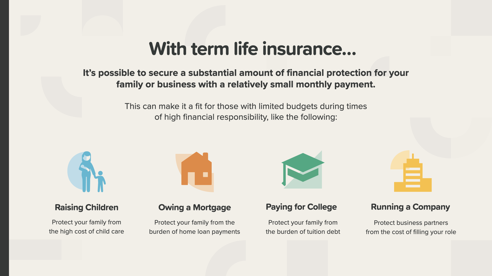 With term life insurance, it’s possible to have financial protection for your family or business with a relatively small monthly payment. This can make it a fit for anyone with a limited budget during times of highest financial responsibility—like raising your children, paying off things like your mortgage or college—and running your company, if you’re a business owner.