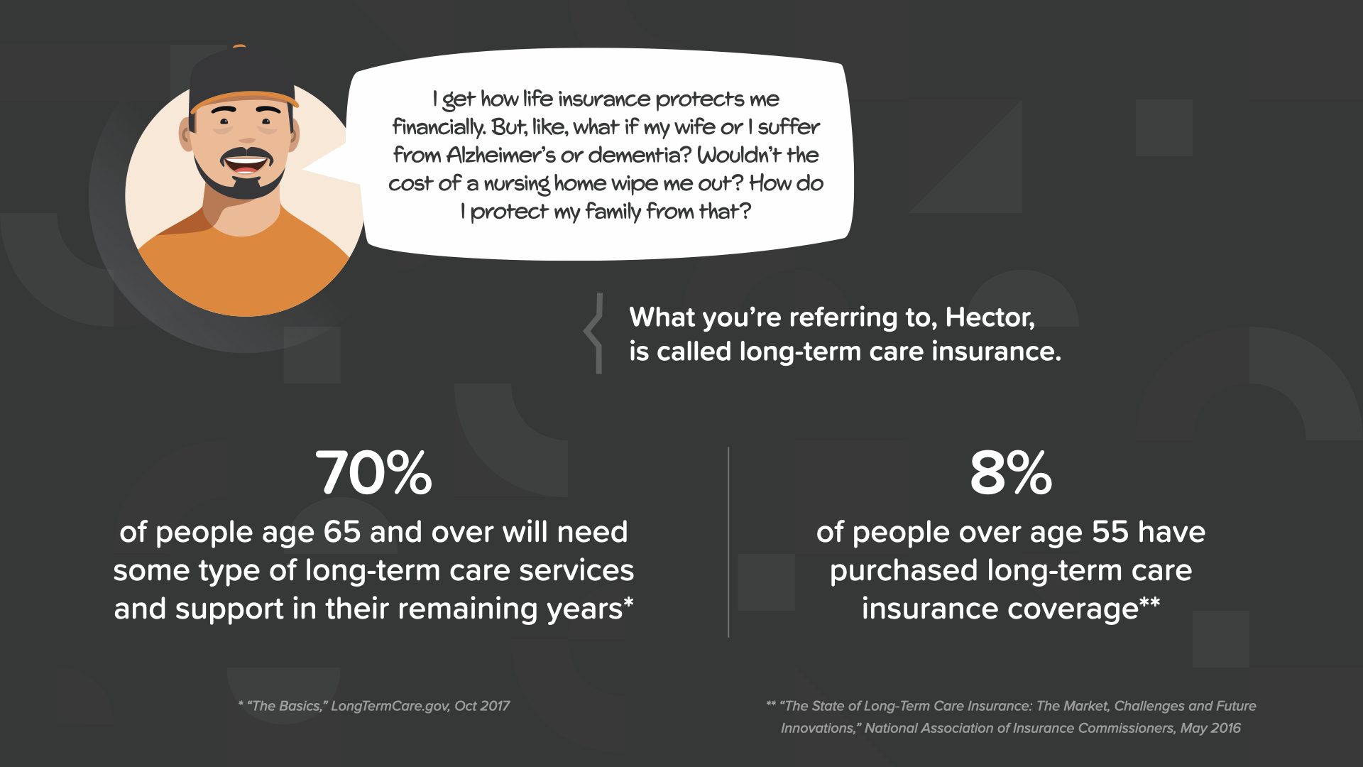 We saw that long-term care can be added to a permanent life insurance policy as a rider, so let’s talk about the importance of long-term care insurance for a moment. You may not know this, but 70% of people age 65 and over will need some type of long-term care services and support at some point in their lifetime. In other words—statistically—you likely will need it. But here’s the thing—only 8% of people over age 55 have purchased long-term care insurance coverage. That sounds like a possible problem—and an expensive one—waiting to happen.