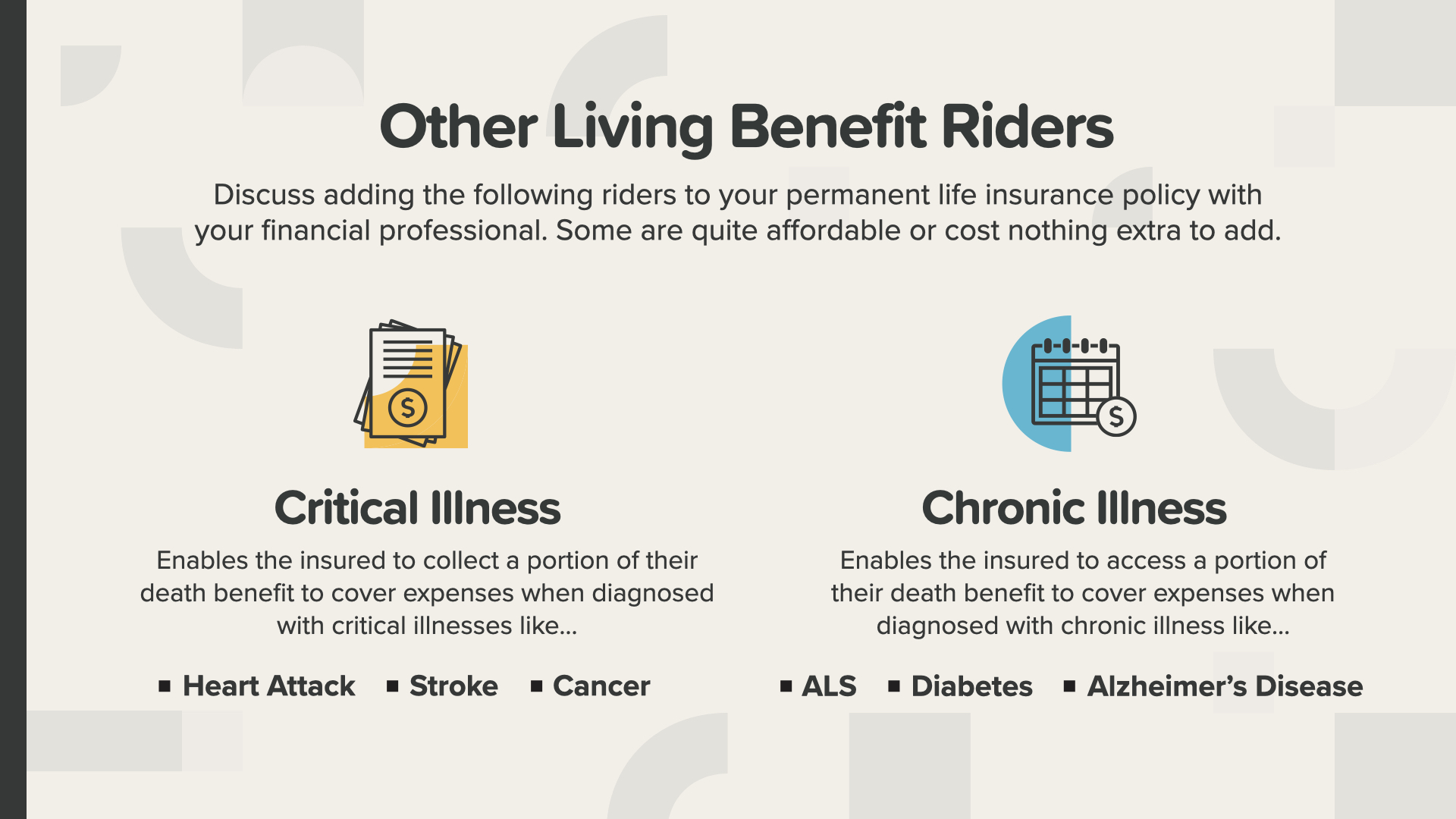 Long-term care riders aren’t the only riders available. You can also consider other living benefits like critical and chronic illness riders that can help save the day if you face any of the health challenges like you see on the screen. You should discuss adding these riders to your permanent life insurance policy with your financial professional. Some are inexpensive or even cost nothing extra to add.