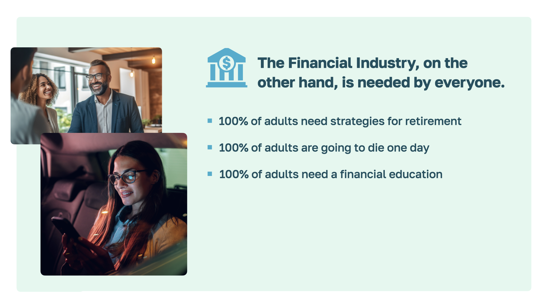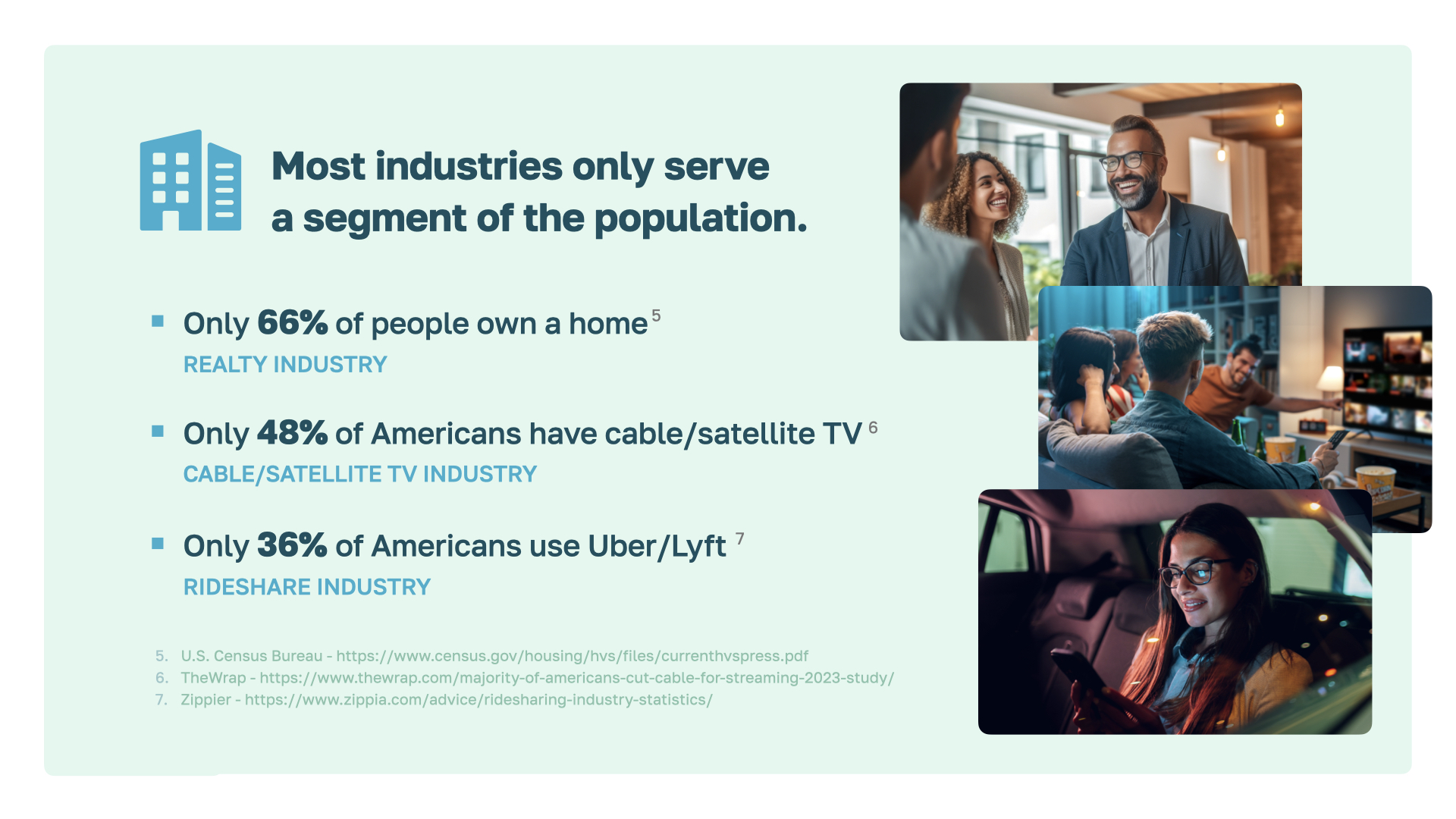 The key point is that the financial industry serves everyone, not just a specific group. 66% of people own a home. Less than half of Americans have cable or use ride share services. But everyone needs a financial education.