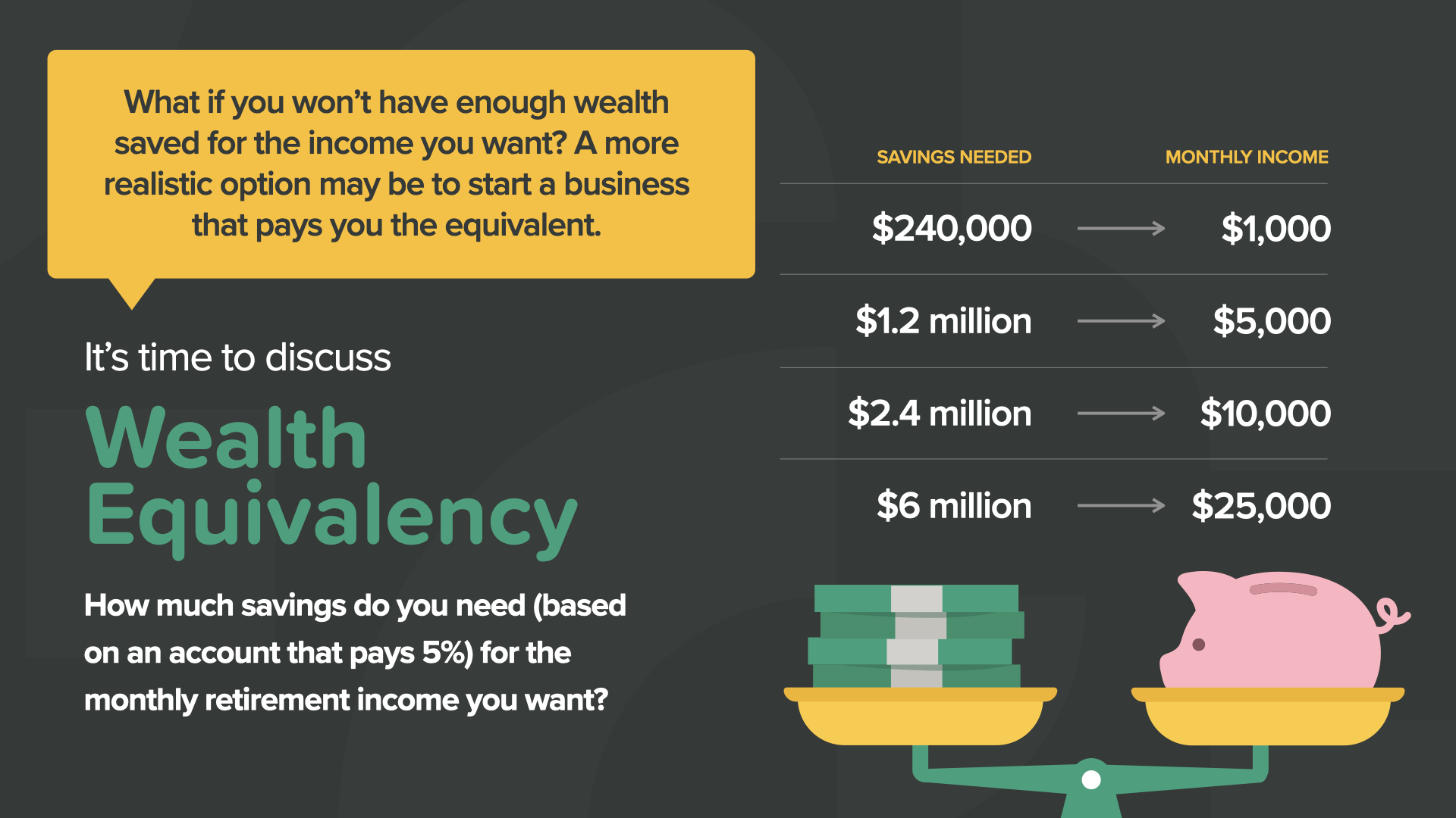 This is where the concept of Wealth Equivalency comes into play. Imagine building a business that can surpass your current savings and earning potential. For example, a business that generates $5,000 of monthly income is comparable to having $1.2 million invested in an account earning 5% annually. Ask yourself, what might be more likely for you? Saving $1.2 million doing what you do today—or—building that income with a business here with us. The choice is yours. What if you could pursue both avenues at once?