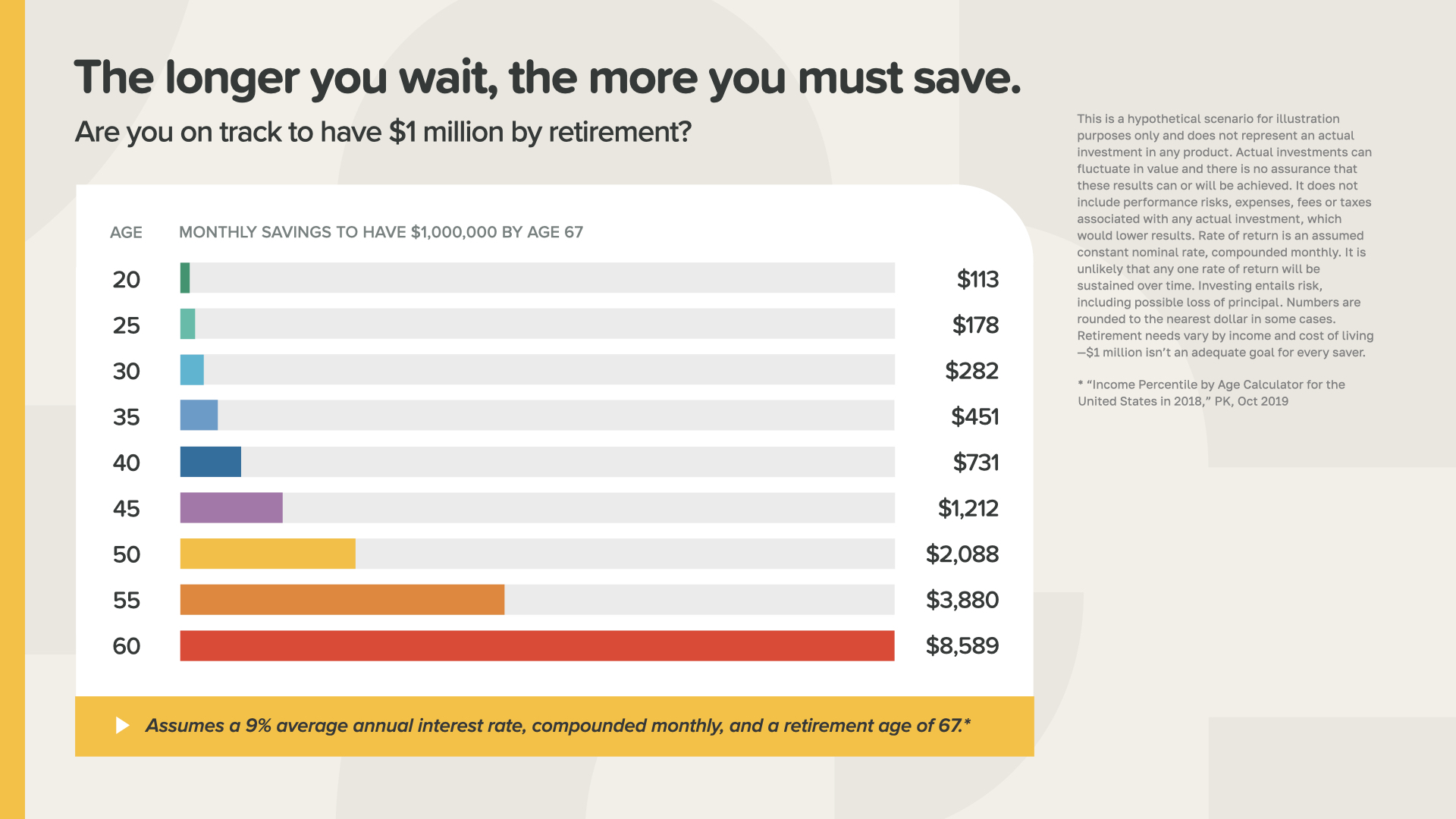 Here’s an example of knowing your Financial Independence Number—the amount of money you’ll need to live the lifestyle you want in retirement. This is a detailed breakdown by age of the numbers for retirement planning. For each million you aim for at retirement, you can calculate the monthly savings needed at a hypothetical 9% interest to reach that goal. At the age of 30, saving $282 monthly would lead to $1 million at retirement. If you wanted $2 million, you would double that. What if you started at age 40? The monthly savings required to have $1 million by retirement jumps to $731! As time goes on, you would reach a point where the monthly savings target becomes unattainable, posing a dilemma: either scale back your dreams or explore ways to increase your income.