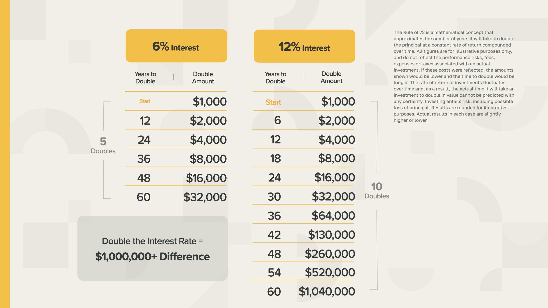 It’s fascinating to think about how interest rates can impact your savings and debt over time. This comparison underscores the significant difference in long-term earnings or payments due to interest rates. In a scenario where the interest rate is 6% versus 12%, doubling the rate could result in a $1 million difference. Just imagine how many families could benefit from grasping this concept.