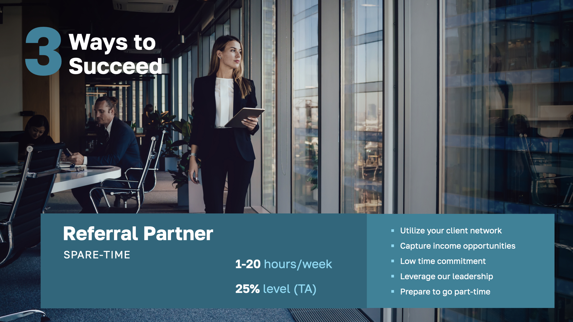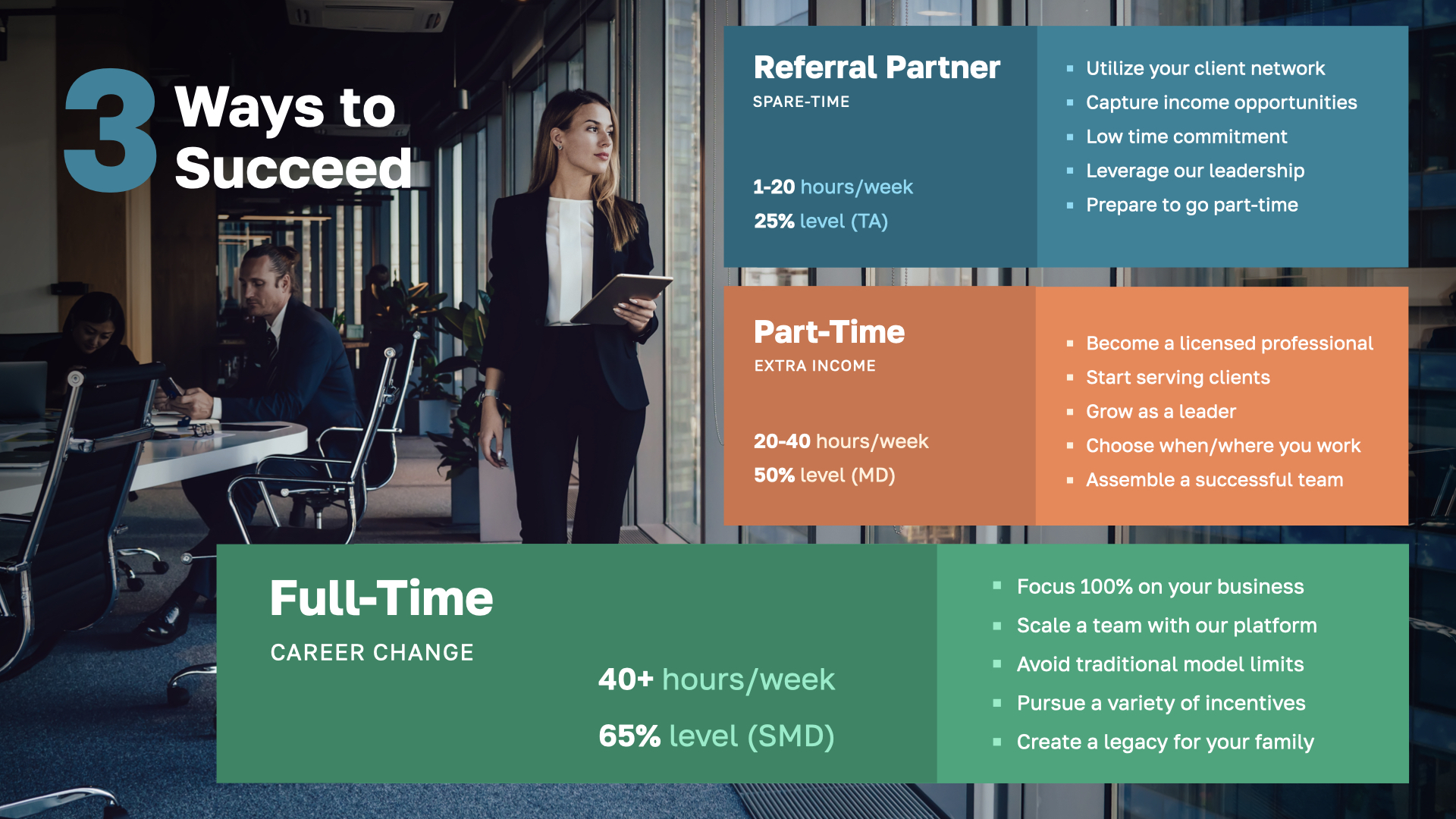 Part Time: As you advance, you transition to setting higher income goals, investing more time and effort with clients, and starting to build your team. This stage enables new leaders to try out this business without the need to quit their full-time jobs, making it accessible even if they are unsure about the industry.