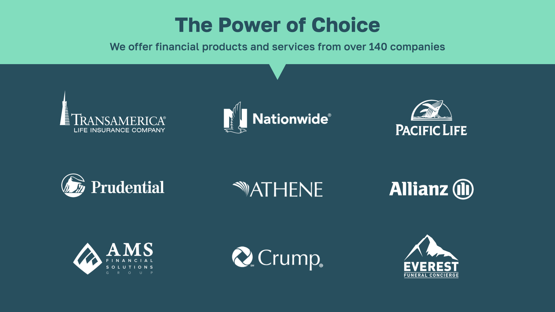 One of the aspects we love most about our firm is our complete independence. We offer a wide range of products and services, representing over 140 product providers—many of which are household names. Do you recognize any of these names? To simplify our approach, imagine a custom clothing store. You can get outfits that perfectly suit you—based on size, color, brand, and price. Similarly, we tailor financial services to meet your specific needs. This advantage of partnering with numerous companies and offering diverse products enables us to always put the client's interests first.
