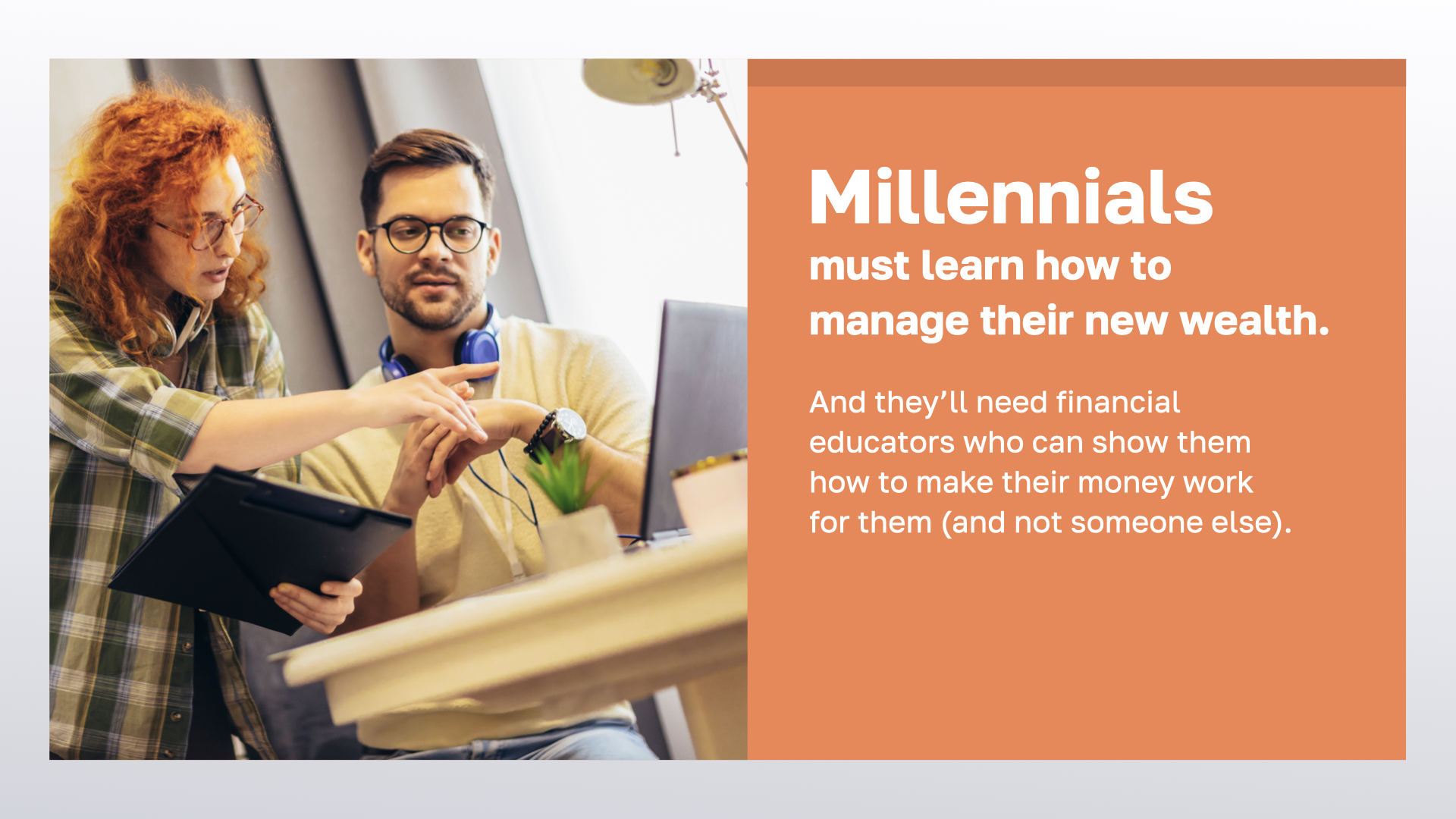 There are actually two challenges wrapped up in this great wealth transfer. First, Millennials must know how money works if they’re going to manage their new wealth wisely. Along with an education, they’ll also need educators to guide them.