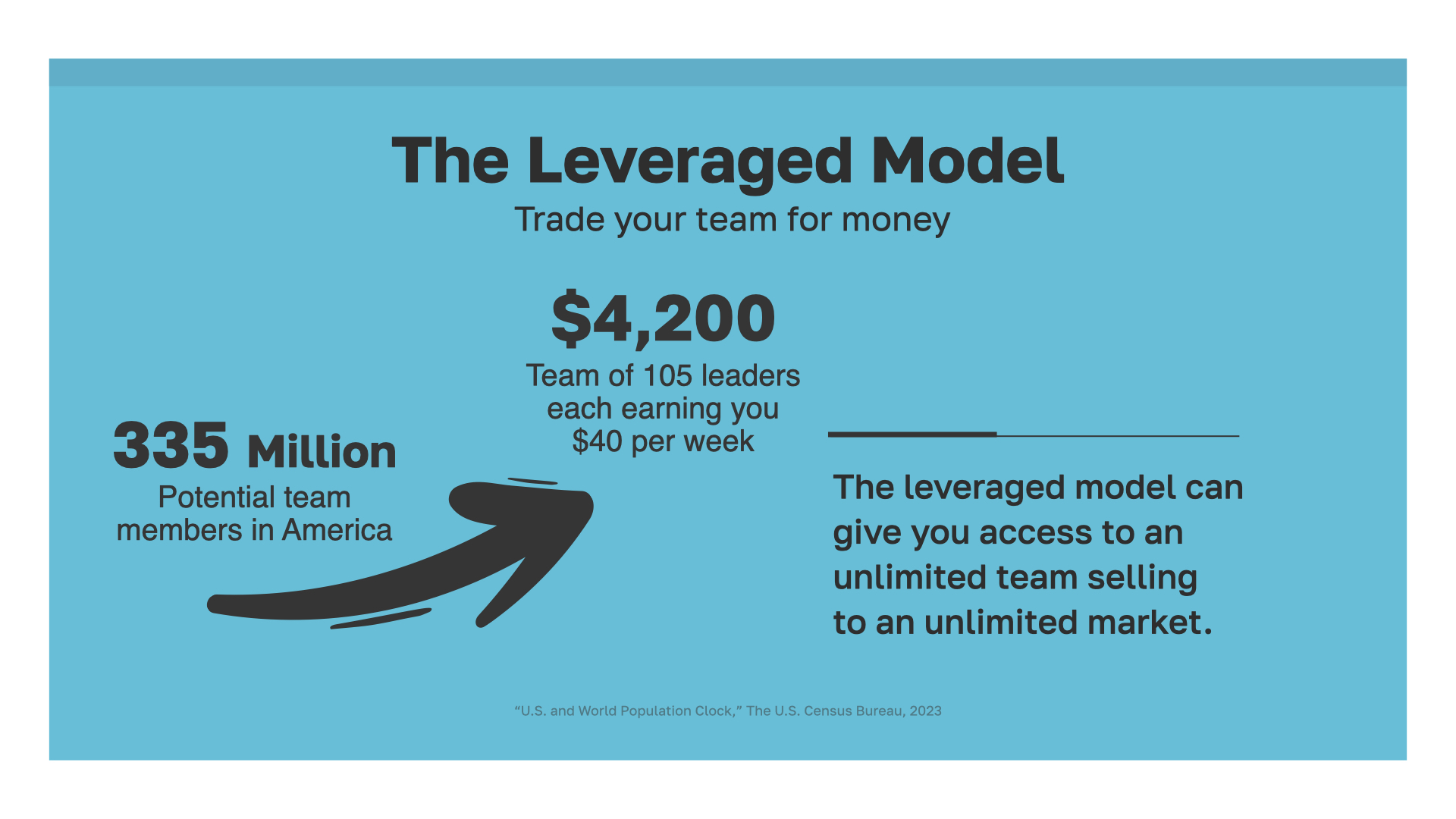 It’s called the LEVERAGED MODEL. What if you had a team of people to help you earn money? You could earn a portion of every sale they made. A team of 105 leaders from which you earn $40 dollars per week would already beat working for an average hourly wage non-stop. And that’s just for starters! There’s no reason to stop building your team! In fact, the potential is essentially unlimited. You can continue scaling your team and your income without sacrificing your whole life.