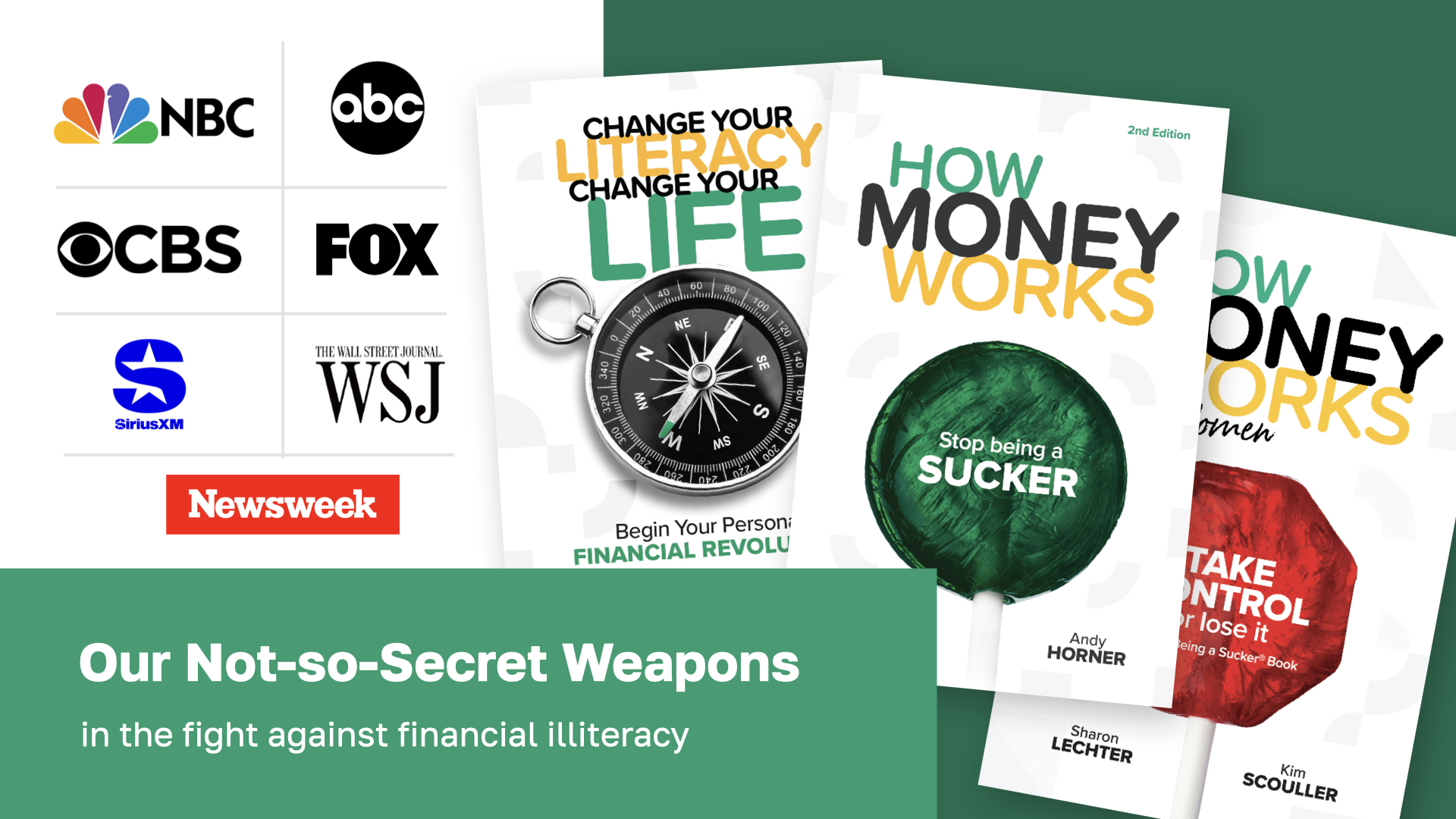 To tackle our mission, we have two books which have sold hundreds of thousands of copies. They have been featured on prominent media outlets, such as NBC, CBS, ABC, Fox, CNBC, and SiriusXM—to name a few.