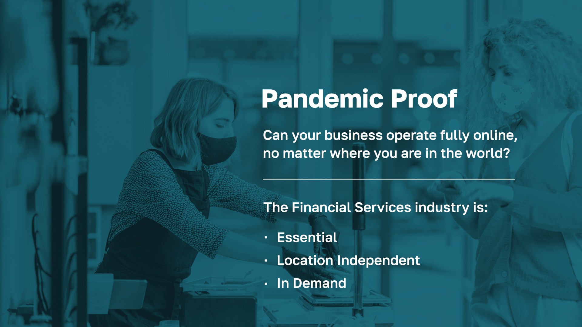 The pandemic attacked businesses like nothing else in our lifetime. Industries like hospitality, event planning, and retail were especially vulnerable to lockdowns due to their dependence on visits to their venues. You need a business model that can run online no matter where you are in the world. Many financial businesses were able to move their services to a digital environment and have thrived over the last few years. By leveraging online tools, they can serve their clients from anywhere, helping families protect their income, grow their savings, leave a legacy, and navigate crazy times financially.