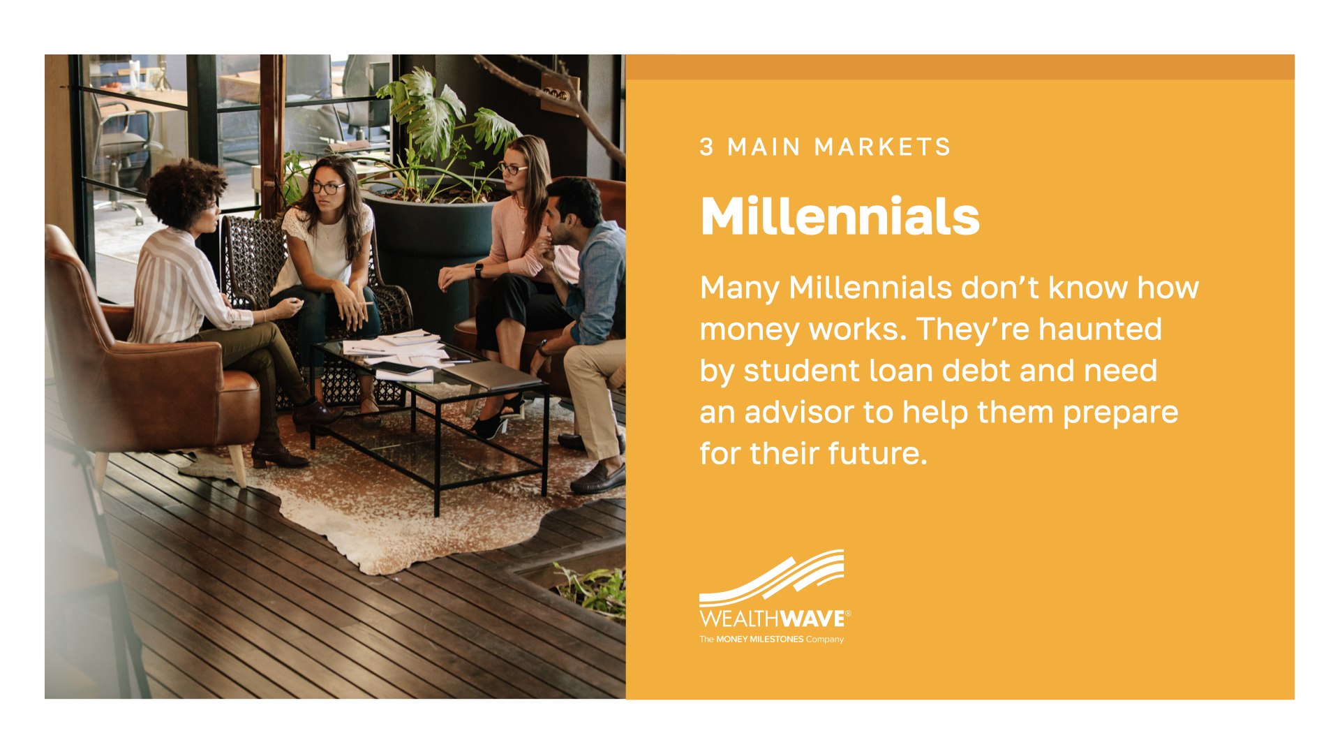 We’ve identified three main markets that the financial industry can help solve problems for. The first is Baby Boomers. Famous for the size of their generation and now facing retirement, Boomers need guidance as they unravel how to afford retirement and pass their wealth on to their children. Many still need a basic education about how money works.