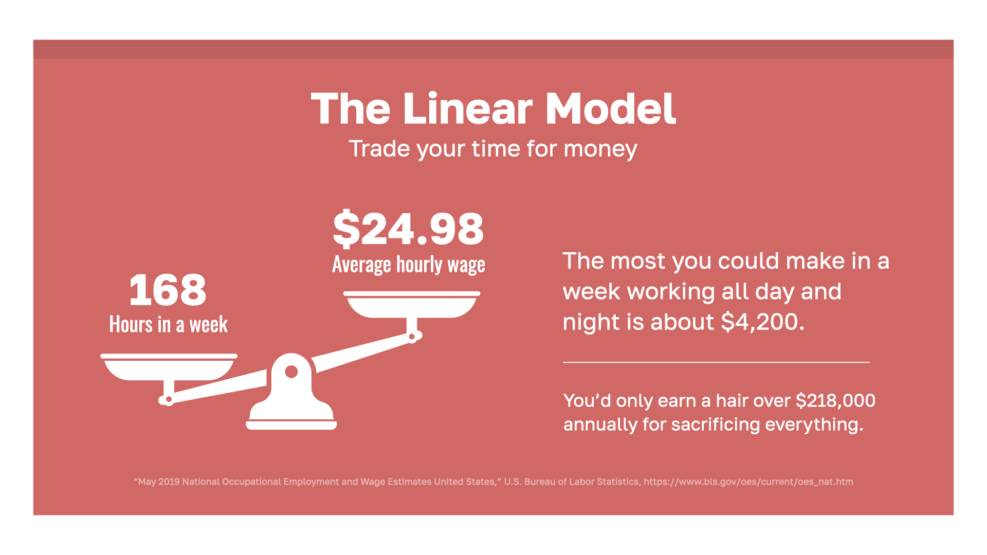 The LINEAR MODEL is the old way of doing things. It’s built for the employee mindset we discussed earlier. You give your time—your employer gives you money. But there are only so many hours in a week. If you worked every moment and never slept, the average salary would earn you about $4,200 per week. That’s if you sacrificed everything. And that’s not even a million dollars per year! If you’re thinking there has to be a better way—THERE IS!…