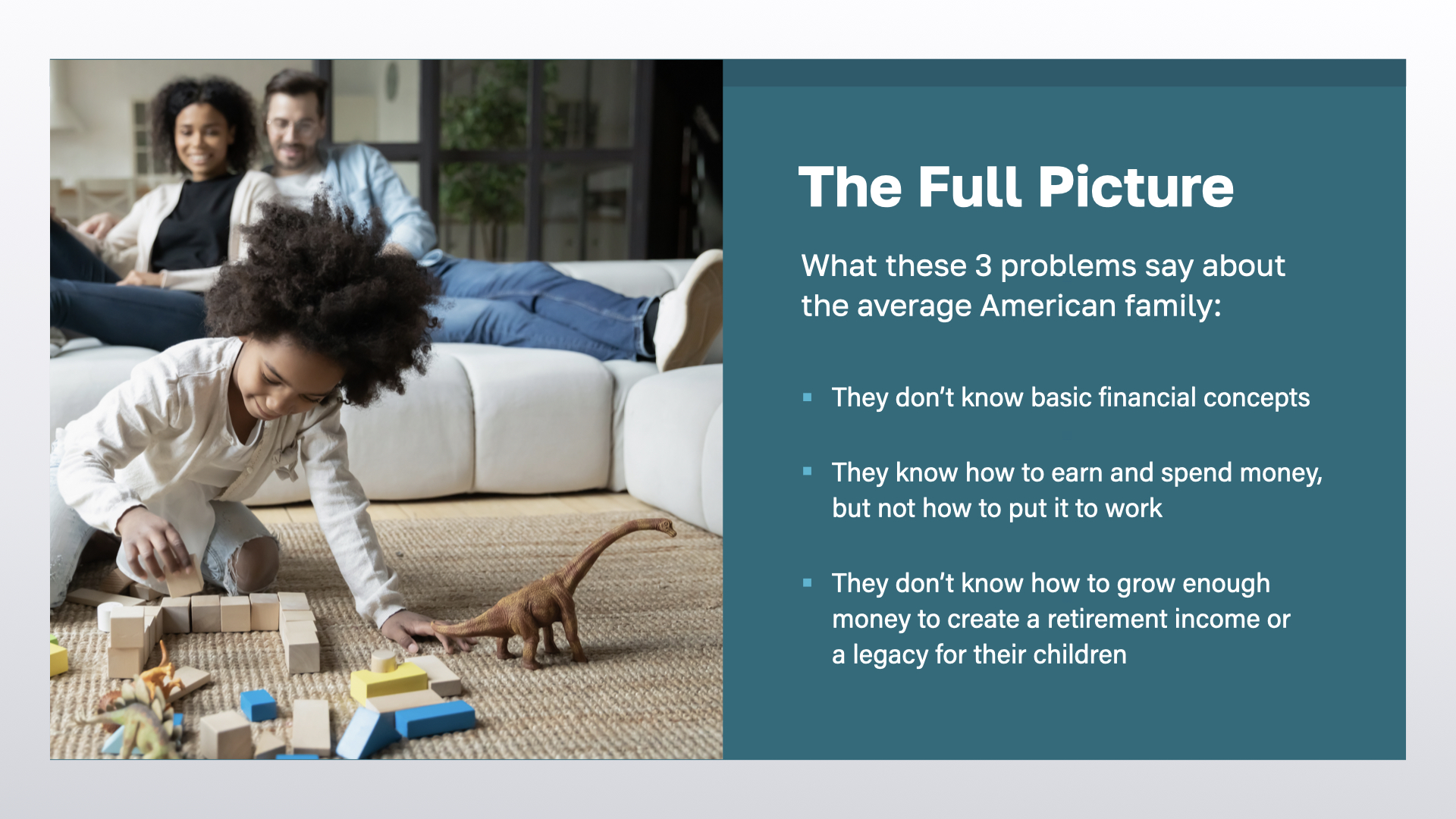 These 3 PROBLEMS we just covered reveal that the average American doesn’t know how money works. They don’t know or understand basic financial concepts. They don't know how to make their money work for them. They don’t know how to earn MORE money beyond what they make at their job. And they’re at a loss for how to grow enough savings for retirement—or even start to think about how to leave an inheritance for their children.