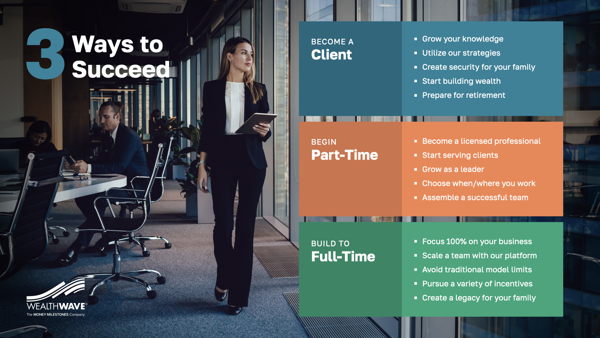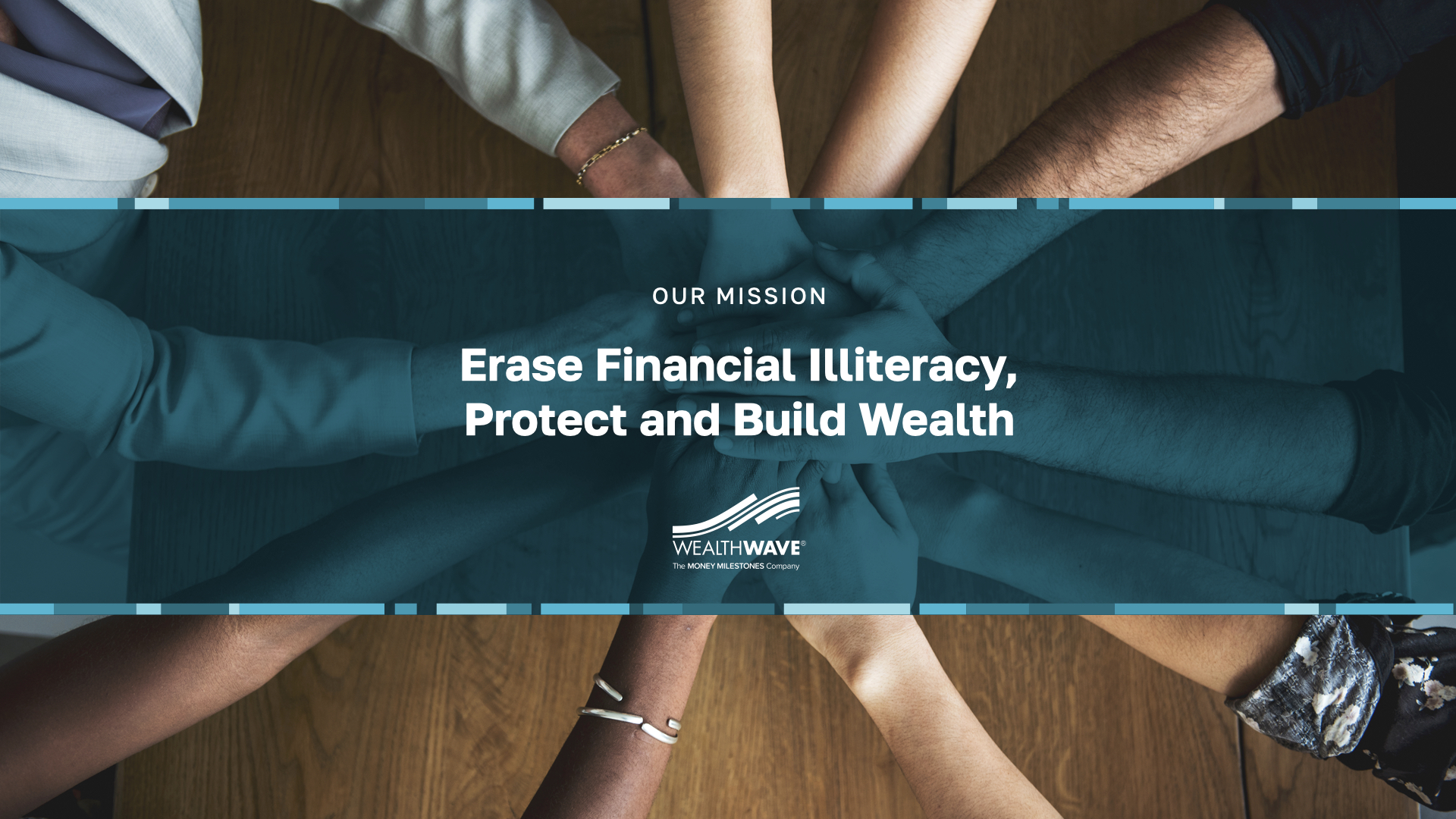 Welcome to WealthWave—The Money Milestones Company. My name is _______________ and today we’re going to discuss The Wealth Crisis and how you can take control of your financial future—and help people everywhere do the same. This crisis affects families in communities all over our nation—they’re overspending, they’re not saving, they’re suffering from big losses in the market and the impact of taxes, they’re buckling under the weight of high debt, they’re unable to retire or they’re running out of money in retirement, and regardless of how much they earned over their lifetime—they’re going broke. During the next few minutes, I’m going to share two things: 1. How we help our clients navigate today’s financial threats with world-class education and powerful strategies, and 2. How we build exciting careers and what WealthWave might look like for you.