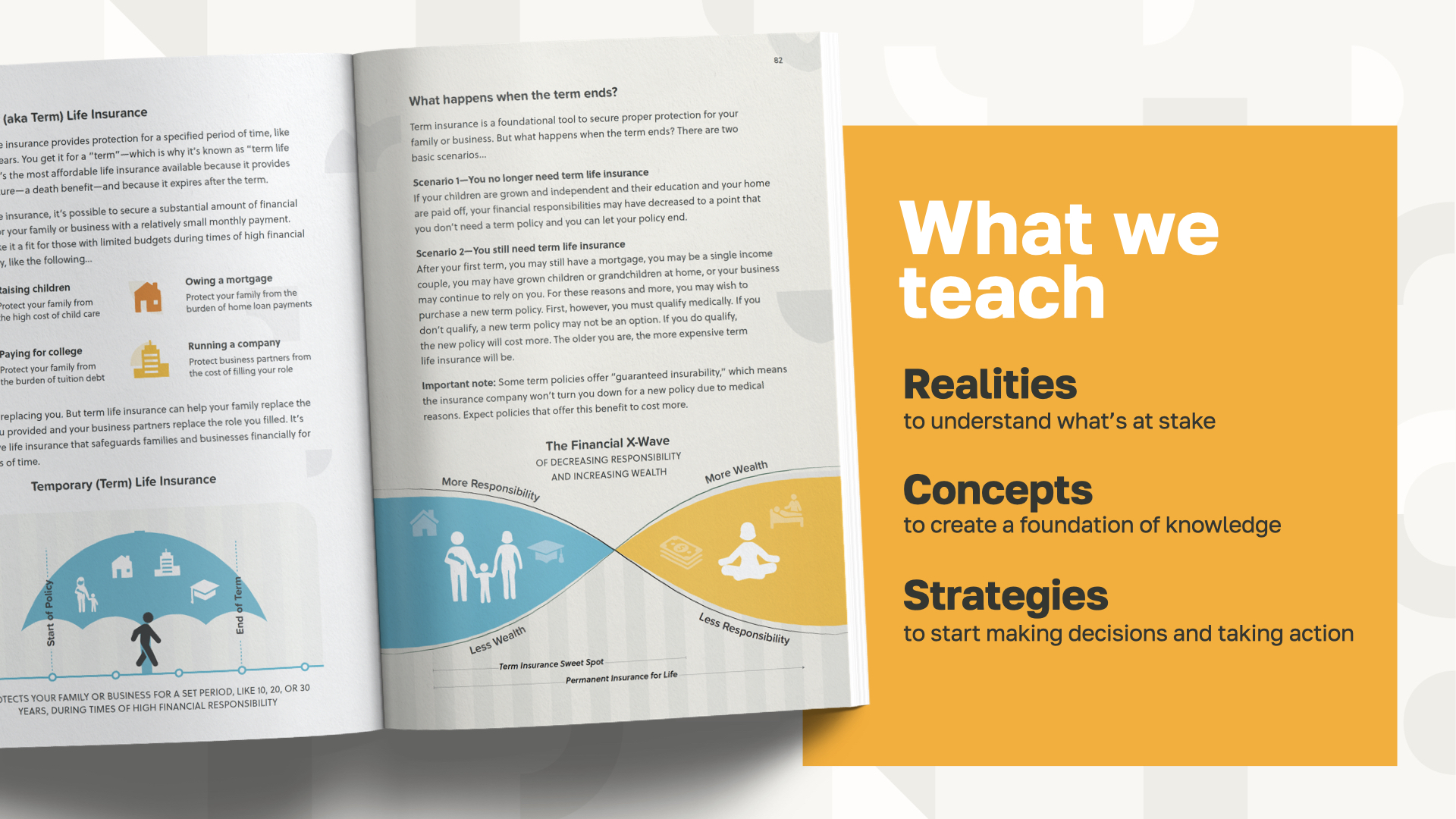 With the books as the foundation of our education system, we then show people how to activate these concepts and put them to work as powerful strategies that make their money work for them for the future.