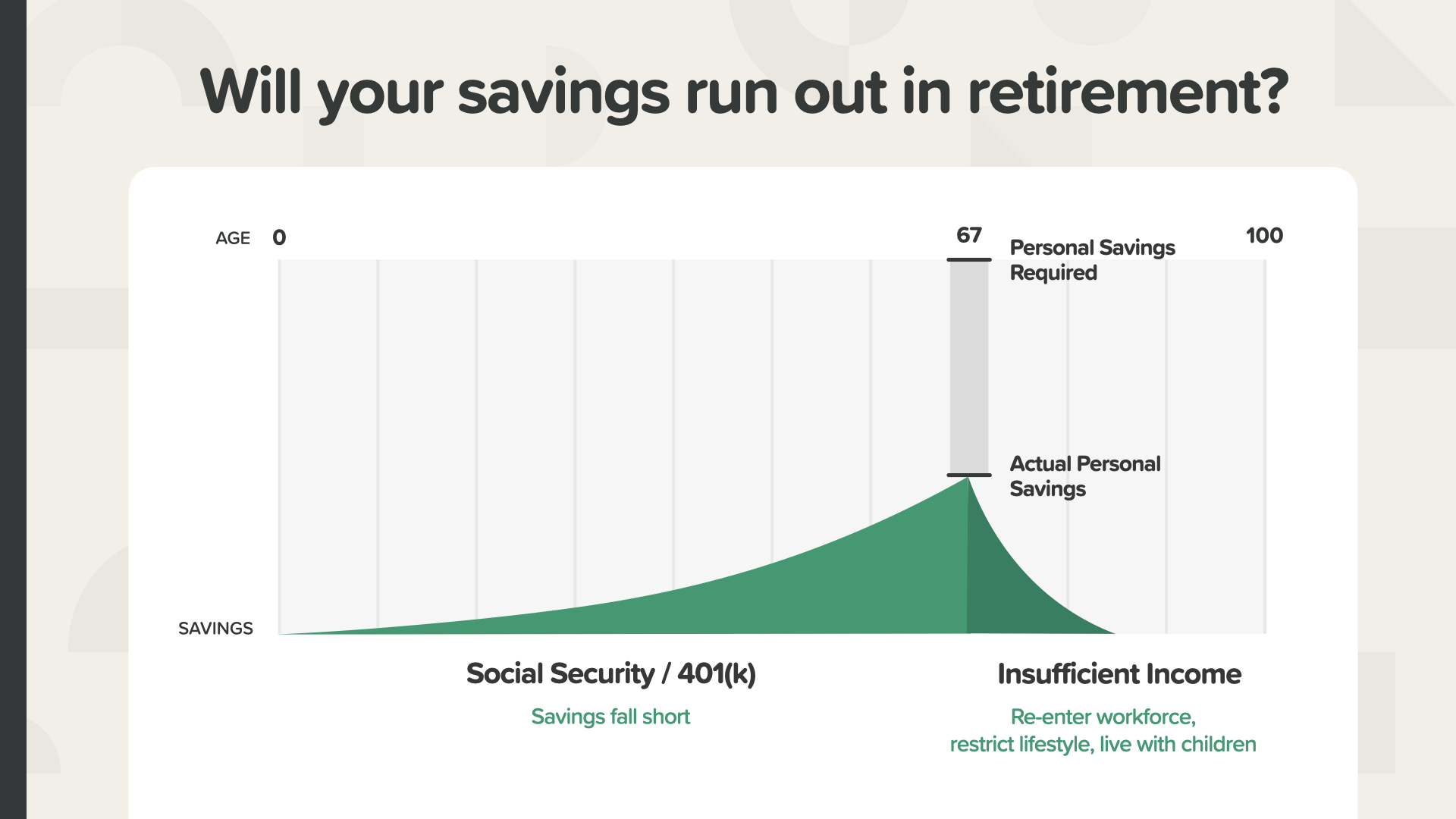Relying on Social Security and a 401(k)—as so many people do today—there could be a wide gap between the retirement income they have—their ACTUAL PERSONAL SAVINGS—and the income they need, which is the PERSONAL SAVINGS REQUIRED. There’s a real financial disparity between where they are and the lifestyle, comfort, and freedom they’re hoping for.
