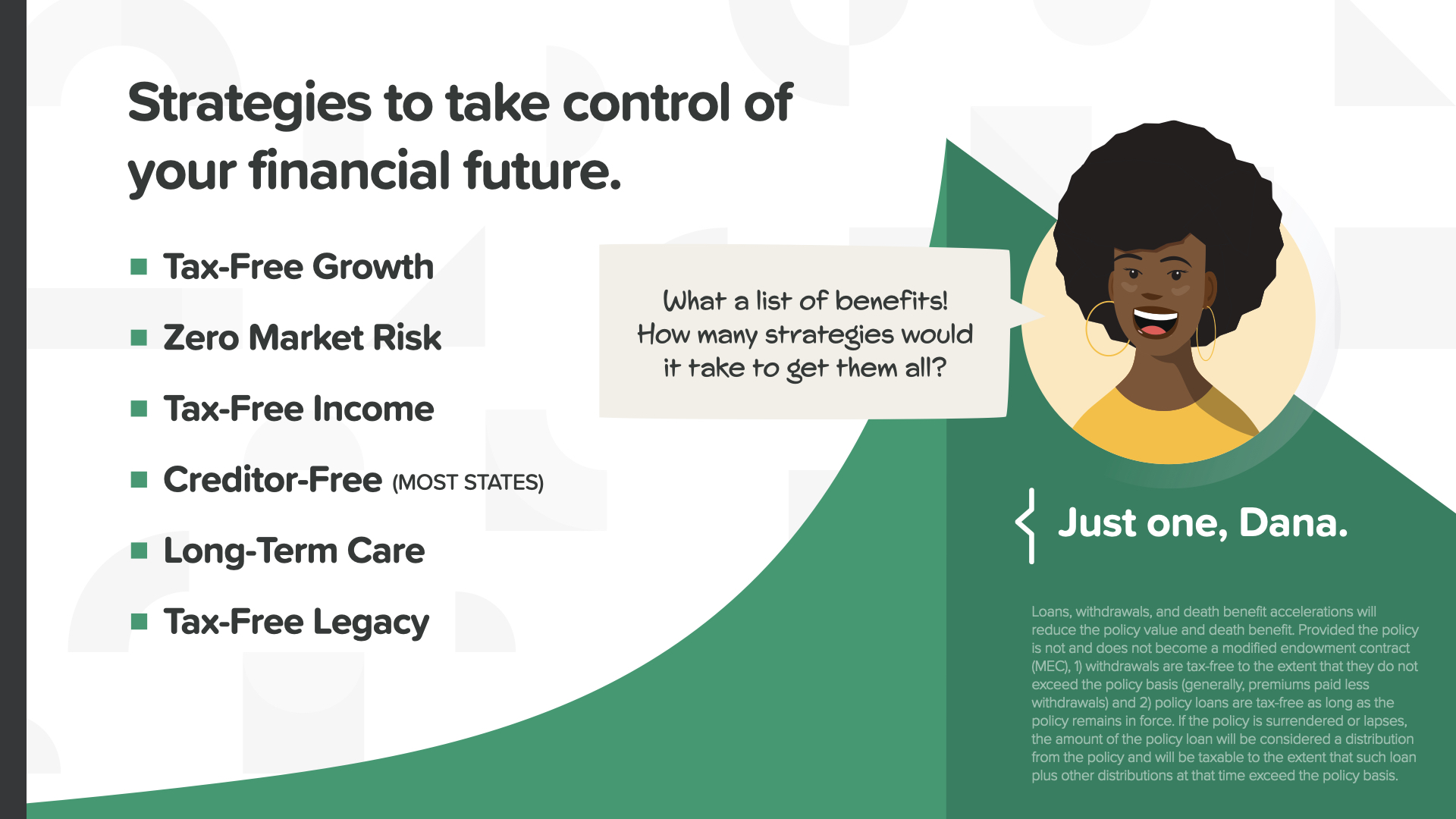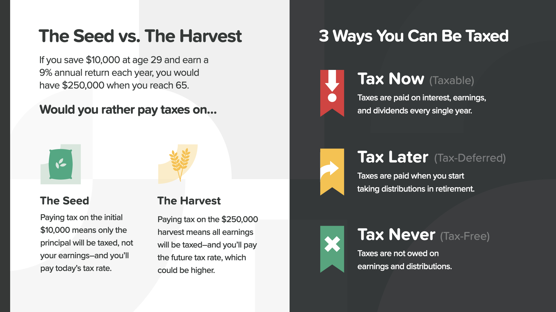 There are 3 ways your money can be taxed. TAXED NOW, like with a CD. TAXED LATER, like with a 401(k) or regular IRA. Or you can position funds so the earnings and income are NEVER TAXED. Which would you prefer? Think of it this way. Imagine you’re a farmer. Would you want to be taxed on a couple of bags of seed or the entire harvest you grow from those seeds? Remember Zoey? At 9%, her inheritance of $10,000 can grow to $640,000. Then let’s say she retires and uses 5% of the $640,000 each year for income. That would be $32,000 per year. If she lives 31 years in retirement that could potentially add up to $1 million in income. So would you rather pay taxes on the initial $10,000 deposit or on the $1.6 million of potential growth and income? That’s an easy decision, right? When it comes to how we’re taxed, it’s essential that we think ahead and then create a TAX NEVER strategy. Do you have one of these in your portfolio?