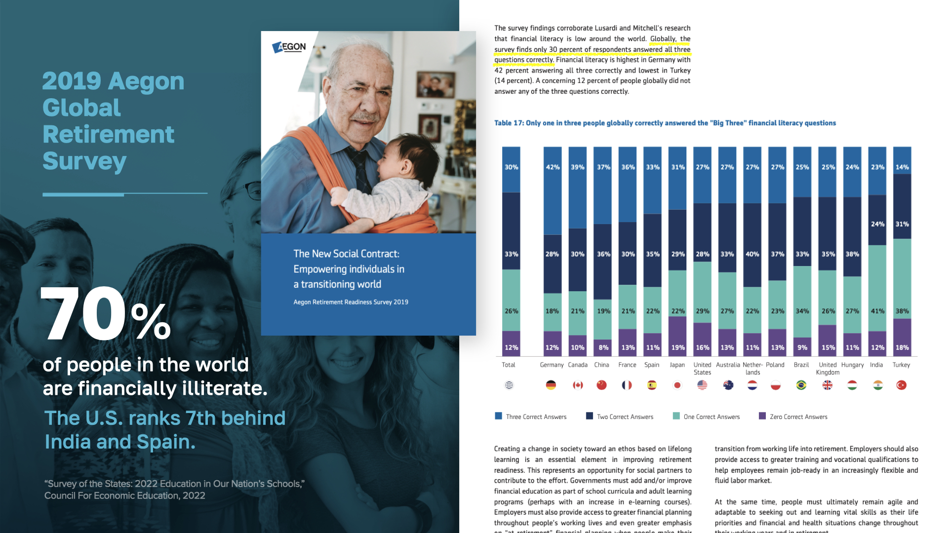 Financial illiteracy is the origin of every problem we solve. It is a massive problem affecting over 5 billion people globally, and the U.S. is far from immune. We actually rank 7th—behind Canada and China. How is that possible in the wealthiest country in the world? Something must change—that’s where we come in! We intend to FIX this problem once and for all.