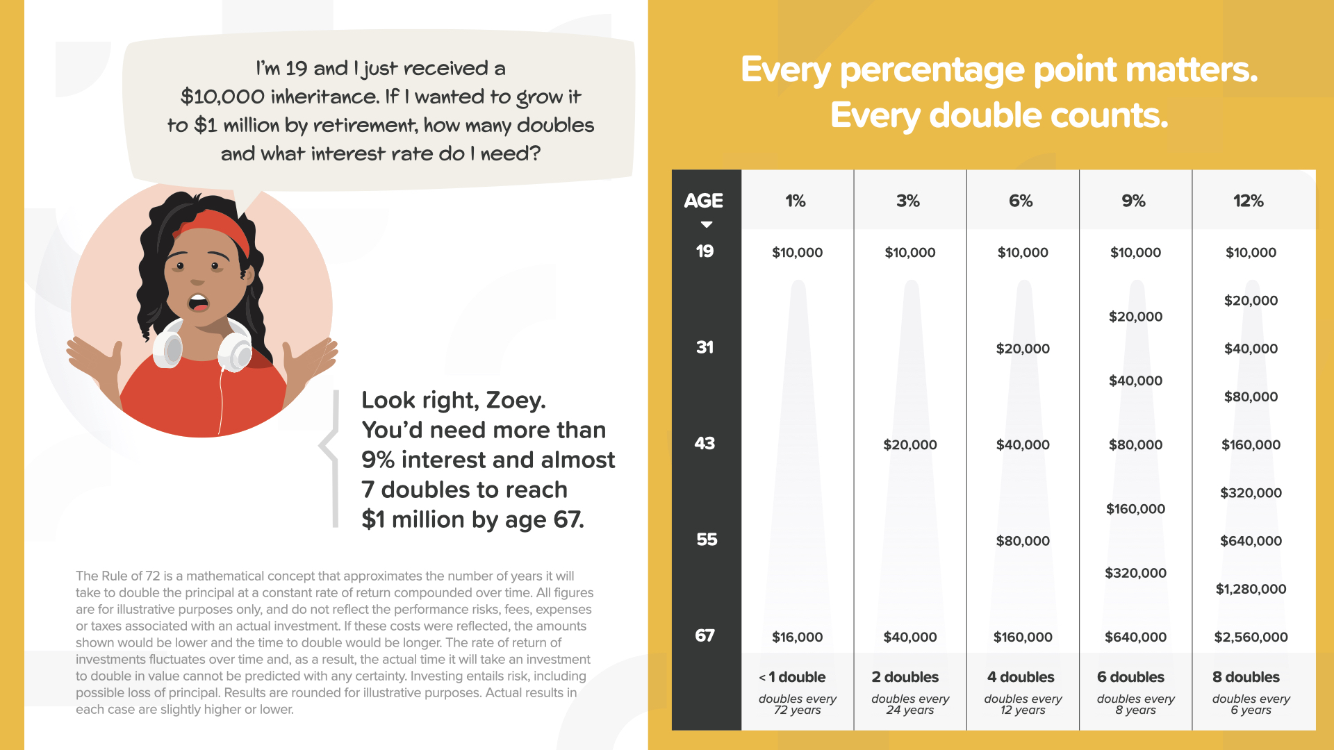 Here’s a hypothetical with the character Zoey from the book. It shows how the Rule of 72 can be applied practically. She’s 19 and she just received a $10,000 inheritance. If she wants it to grow to $1 million by the retirement age of 67—48 years away—what interest rate does she need on her money? Look at the chart on the right—1% gives her less than 1 double, getting her to just $16,000. 3% gives her 2 doubles, still not enough. 6% gives her 4 doubles—not enough. Even 9%, which will double her money 6 times, only gets her to $640,000—still $360,000 shy of her goal. She’ll need more than a 9% interest rate to reach $1 million by retirement. Seeing this visually, do you think Zoey would intentionally put her $10,000 in an account that earns 1%, 2%, or even a 3% return? No way! She’s going to look for the biggest interest rate she can get, knowing what her decision could cost her. That’s the power of the Rule of 72 and the importance of understanding financial concepts. The Rule of 72 is a cornerstone of our education, as is teaching people about the Time Value of Money...