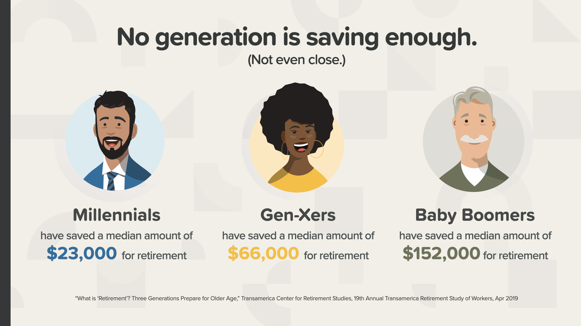 We’ve talked about how little people are saving, but do the statistics agree? Yes!—for every generation. The average Millennial only has $23,000 saved for retirement. The Gen-Xers—at $66,000 and with a lot less time left—are not much better off. Even Baby Boomers—who are crossing into retirement now—have only saved $152,000. How many years could you live on that in retirement? Picture this: After reviewing your finances, your financial professional says, “I’ve got good news for you Mr. and Mrs. Smith, as long as you die in 3 years, you’ve got plenty of money saved.” Can you imagine that?