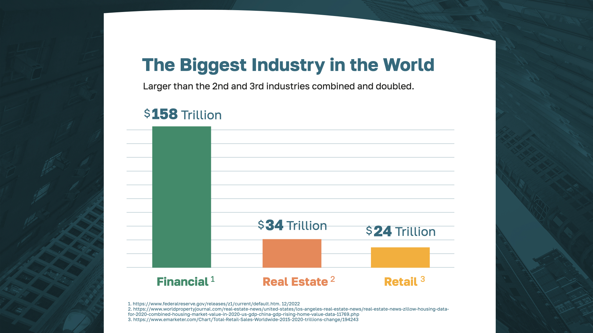 What do you think is the biggest industry in the world? Many think it’s real estate, some would guess retail. The financial industry is actually more than double the size of the real estate and retail industries combined. No industry is bigger than the financial industry!