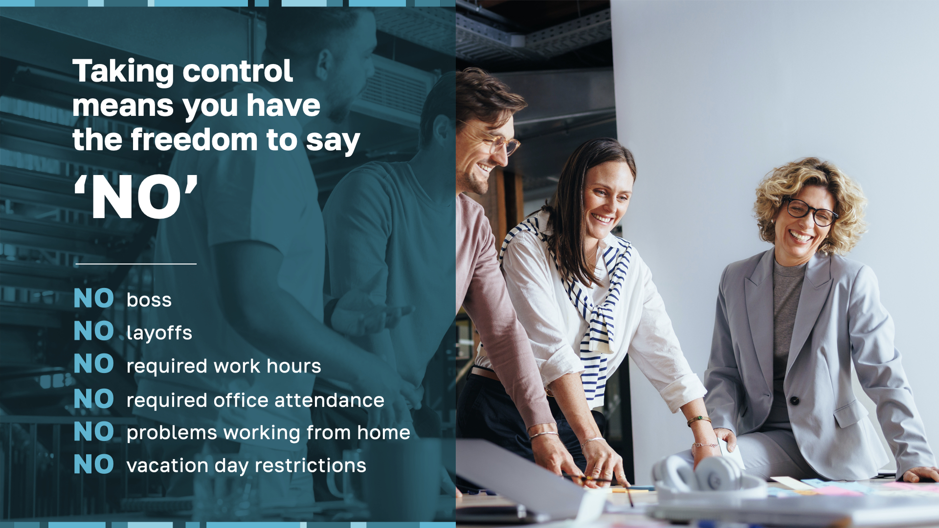 Think about your current job for a minute. Does it have the horsepower to deliver the freedom over your time and money that you’re looking for? Being an entrepreneur gives you the freedom to say ‘NO.’ [[[ Read list of ‘No’s’. ]]] Of all these items on the list, LIFESTYLE is most important. When we’re 80 years old, we’re not going to care how hard we worked to impress the boss—it’s the memories you create with friends that matter and the lifestyle you and your family enjoy that you’ll remember.